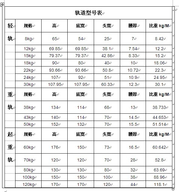 軌道型號表